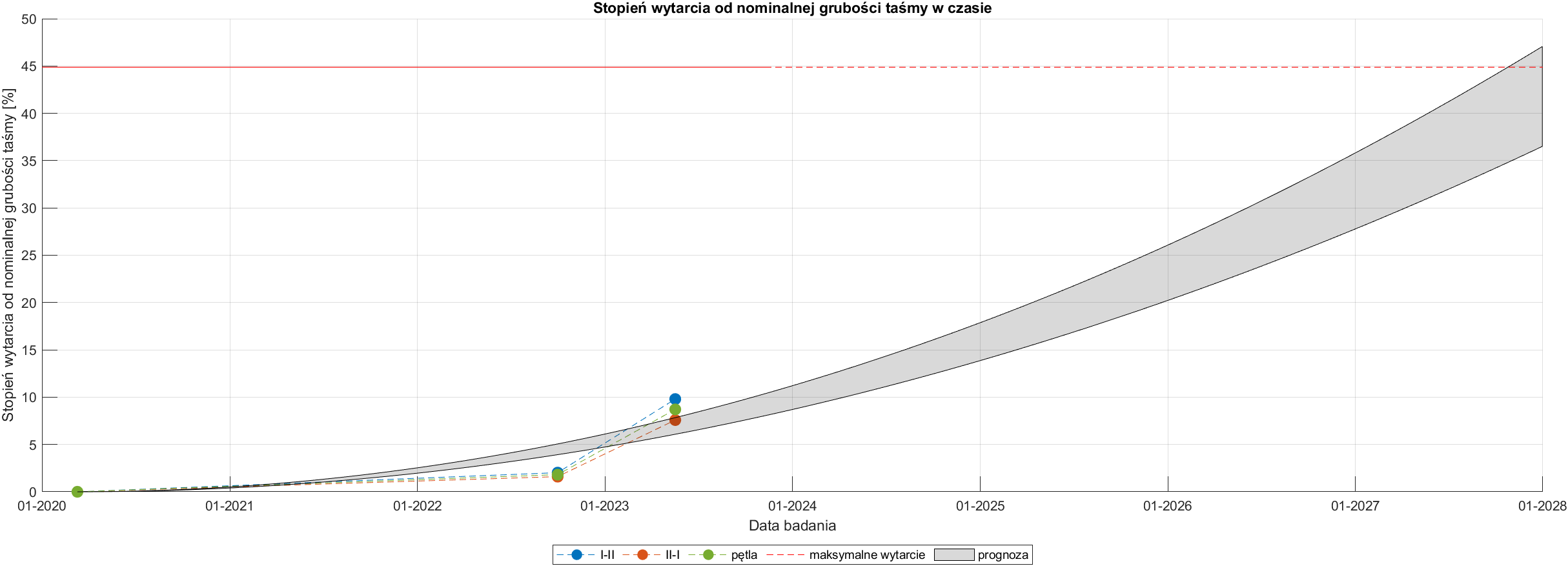 Punkt „0” na krzywej jest oparty na nominalnej grubości taśmy oraz dacie jej instalacji. Kolejne pomiary grubości pozwalają na budowę krzywej, która staje się coraz bardziej reprezentatywna i dokładna w miarę akumulacji danych. Innymi słowy, im więcej pomiarów, tym krzywa predykcji staje się bardziej wiarygodnym narzędziem analizy.