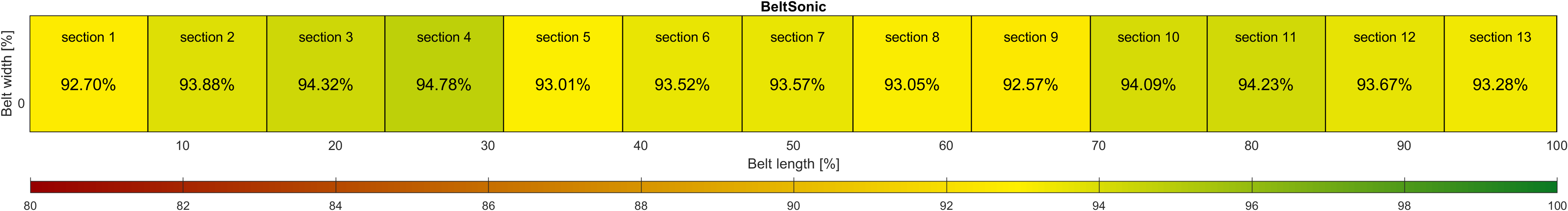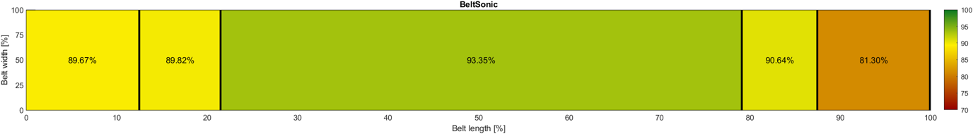 BeltSonic wykorzystuje 50 par ultradźwiękowych czujników odległości, zapewniając ciągły i precyzyjny pomiar grubości z wysokoką rozdzielczością wzdłużną i poprzeczną