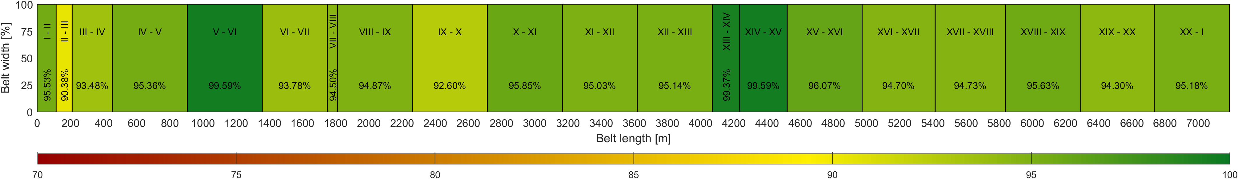 Kodowana kolorami mapa stanu technicznego taśmy stanowi narzędzie, które pozwala na podejmowanie decyzji związanych z utrzymaniem taśm w dobrym stanie technicznym.