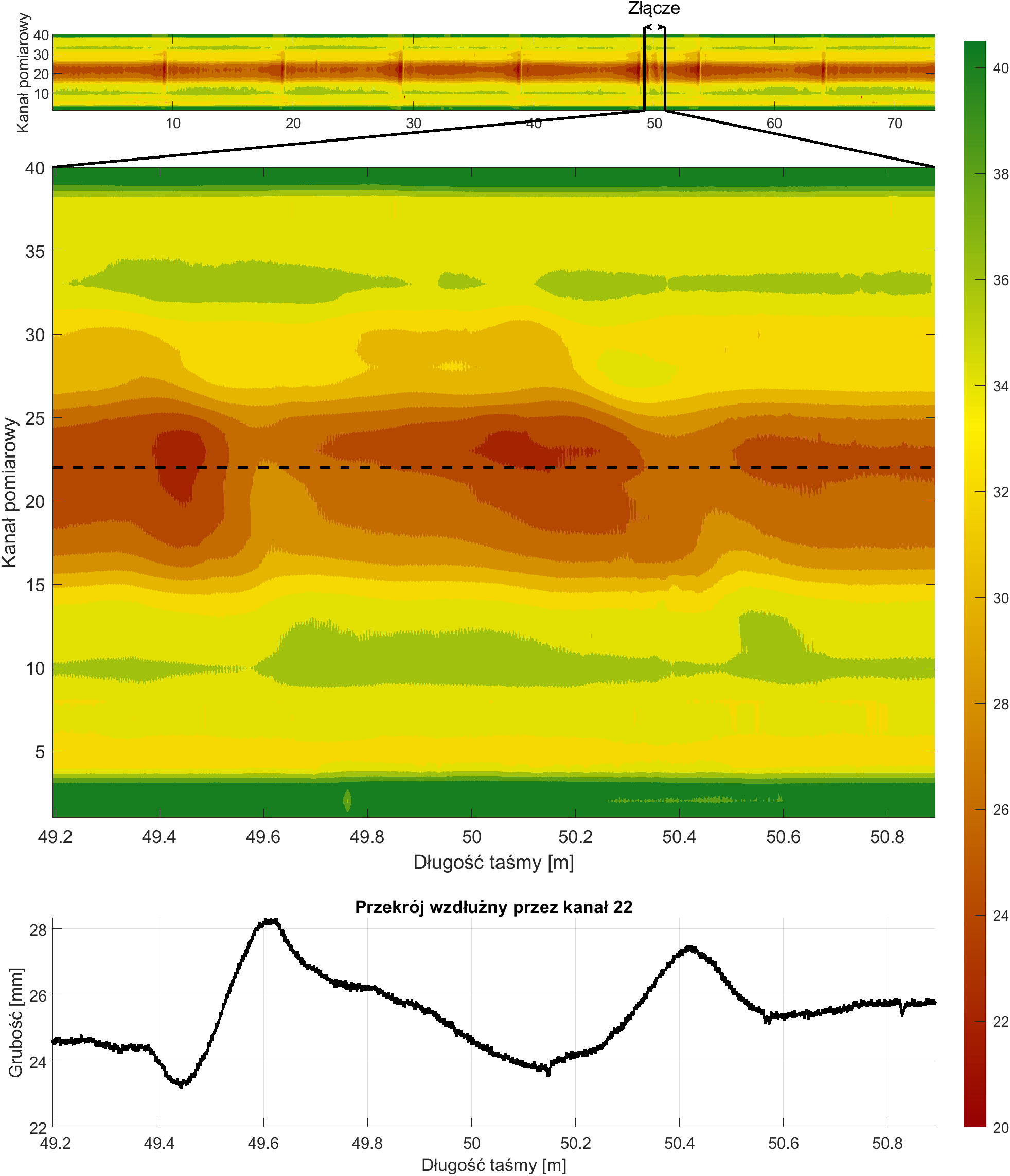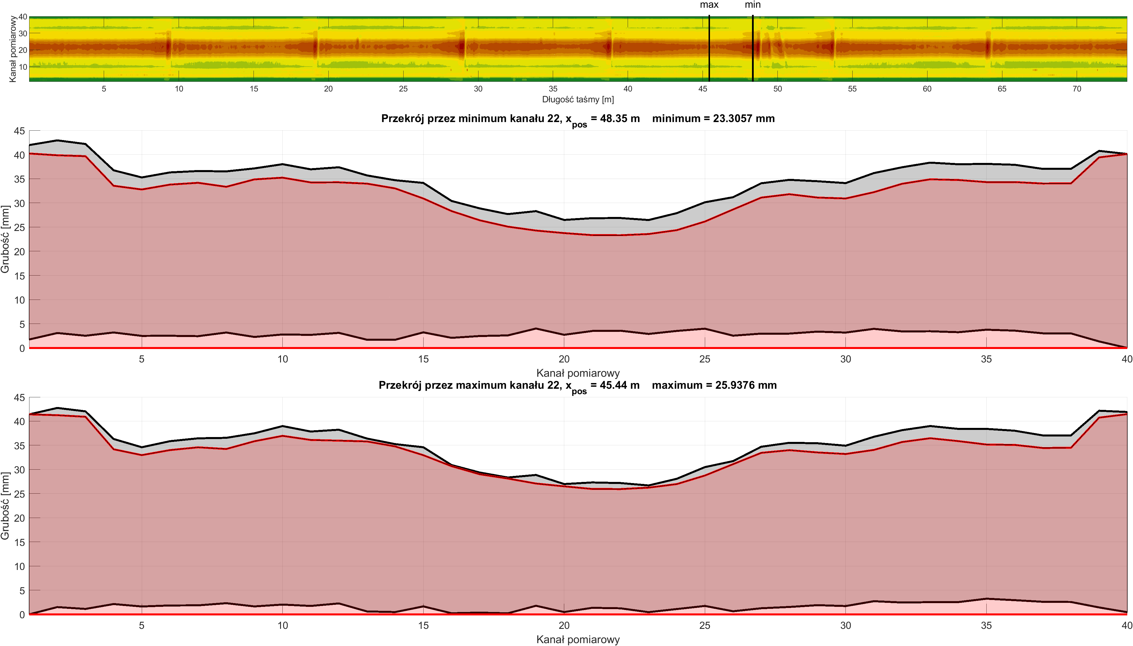 Oprogramowanie umożliwia również generowanie przekrojów poprzecznych przez konkretne kanały pomiarowe. Ta funkcjonalność pozwala na lepszą wizualizację zmian wartości grubości na długości taśmy i może prowadzić do odkrycia ukrytych związków i zależności.