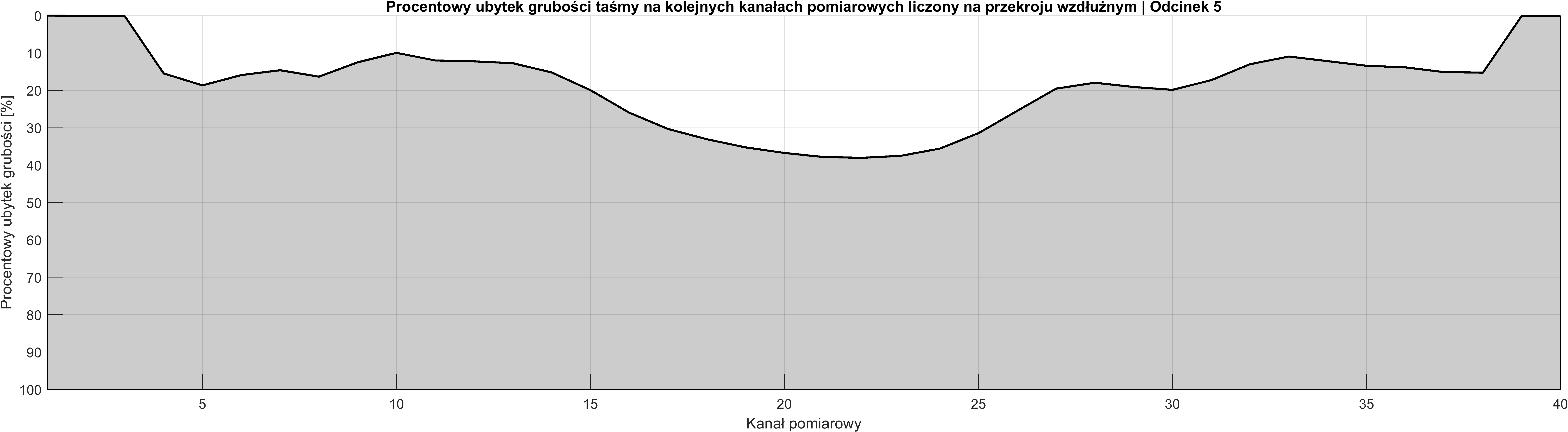 Analiza procentowego ubytku grubości na przekroju poprzecznym (w odniesieniu do grubości nominalnej taśmy) stanowi skuteczne narzędzie do oceny zmian w grubości badanych obiektów i lokalizacji potencjalnych błędów konstrukcyjnych, powodujących nadmierne wycieranie się taśmy na pewnym obszarze. To narzędzie, które umożliwia identyfikację obszarów o największych zmianach i może wskazać na potencjalne problemy czy potrzebę interwencji.