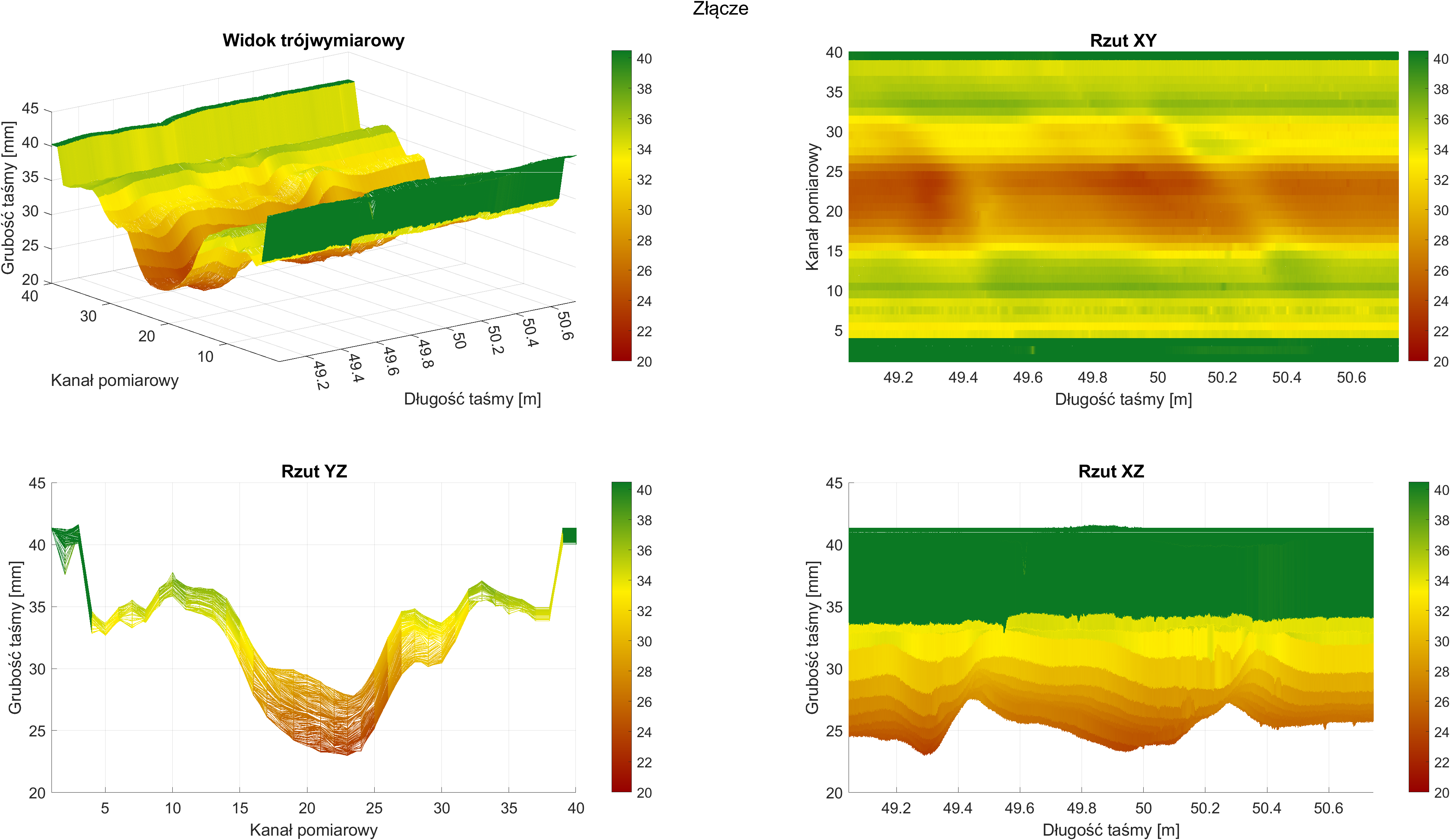 Rzut XZ pozwala na szczegółową analizę zmian grubości wzdłuż całej długości taśmy. Można obserwować, jak grubość zmienia się na przestrzeni taśmy, identyfikować kluczowe obszary zmian i analizować potencjalne wpływy czynników zewnętrznych.