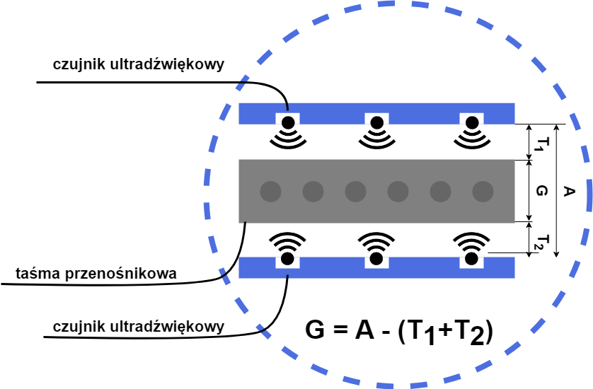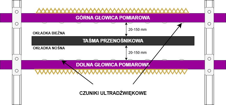 Metoda Różnicowa w Pomiarze Grubości: Nad i pod badanym obiektem umieszczone są czujniki ultradźwiękowe, które precyzyjnie mierzą odległość do powierzchni obiektu. Korzystając z tej metody różnicowej, która opiera się na wyznaczeniu grubości obiektu przy wykorzystaniu wskazań czujników oraz znanej odległości między czujnikami tworzącymi parę, możliwe jest dokładne określenie grubości badanego obiektu. Ta technologia zapewnia nie tylko precyzję, ale również minimalizuje zakłócenia związane z warunkami otoczenia (drganiami taśmy), dzięki zastosowanemu montażowi głowic pomiarowych na zewnętrznej, niezależnej od przenośnika konstrukcji.
